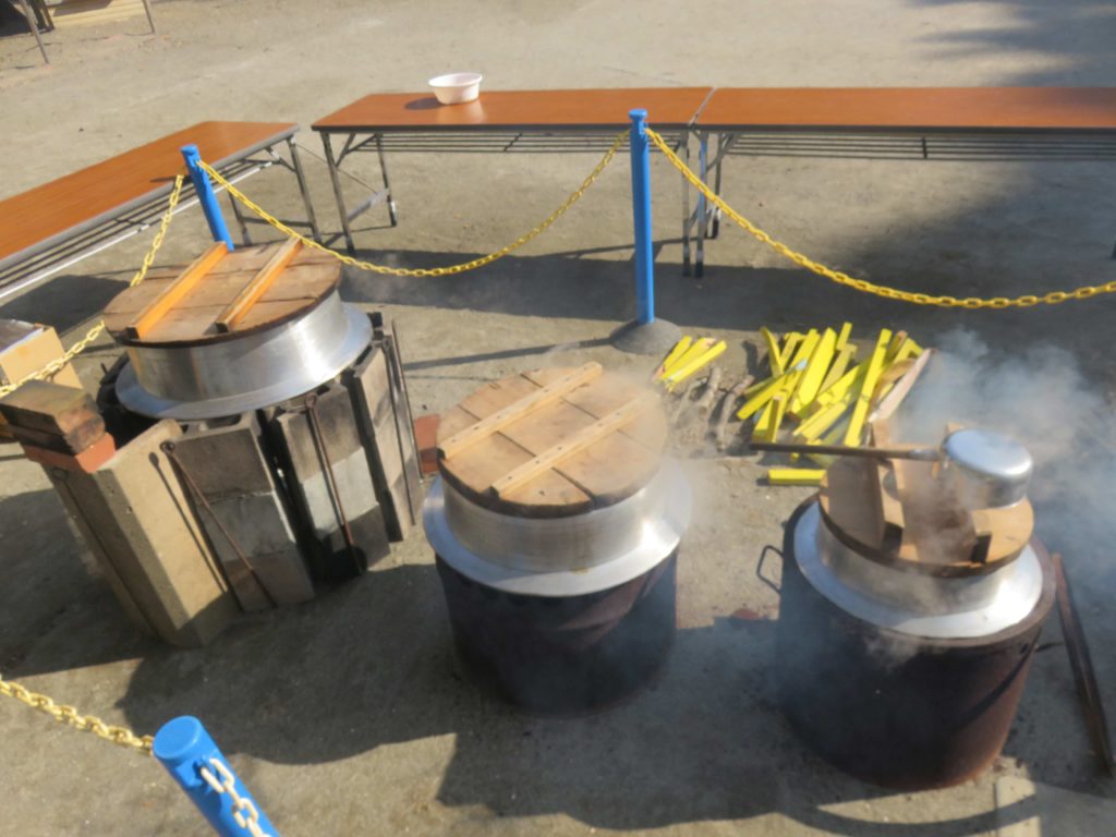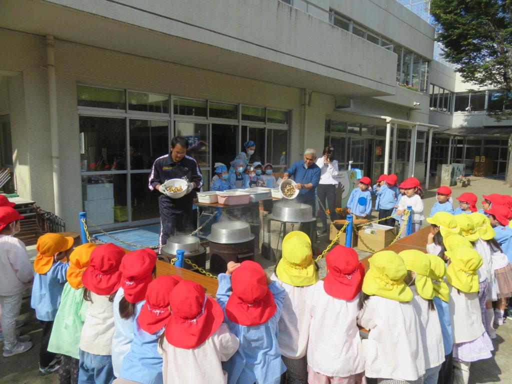小中台幼稚園恒例の「さつま汁」を年長児が作り、全員にご馳走してくれました。園庭に竈を作り、大きな釜で作ります。さつま芋の他にたくさん野菜を入れてぐつぐつ煮ます。
