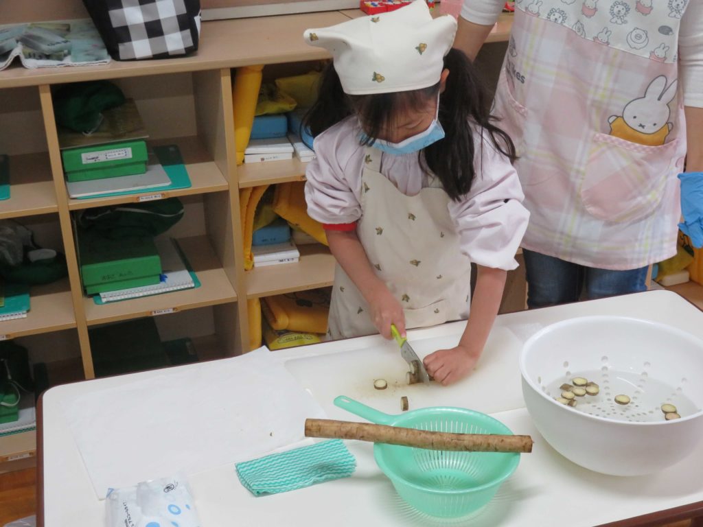 家では食べない子がみんなと一緒だと食べられたり、今まで嫌いだったものが美味しく感じたりと毎年集団の力の素晴らしさを感じます。年長児はとくに、自分たちで作ったという満足感や達成感が大きく、一昨年度は全く口を付けられなかったのにお代わりを何回もする子がいました。朝から竈の火や煙にワクワクしながら過ごした楽しい一日でした!