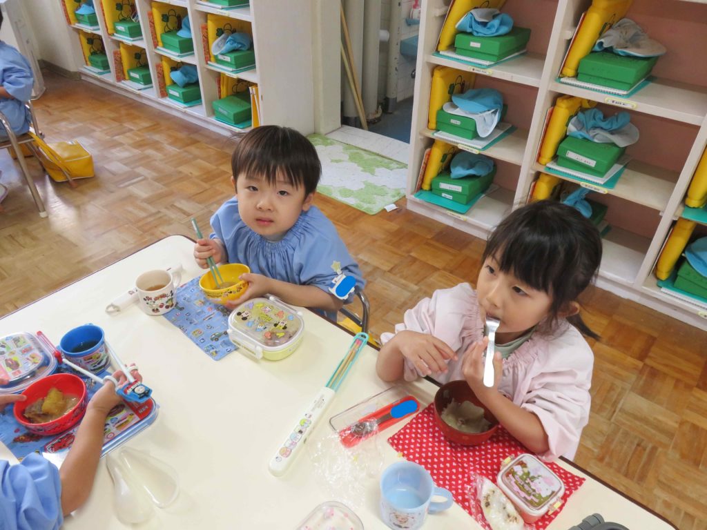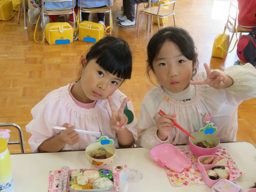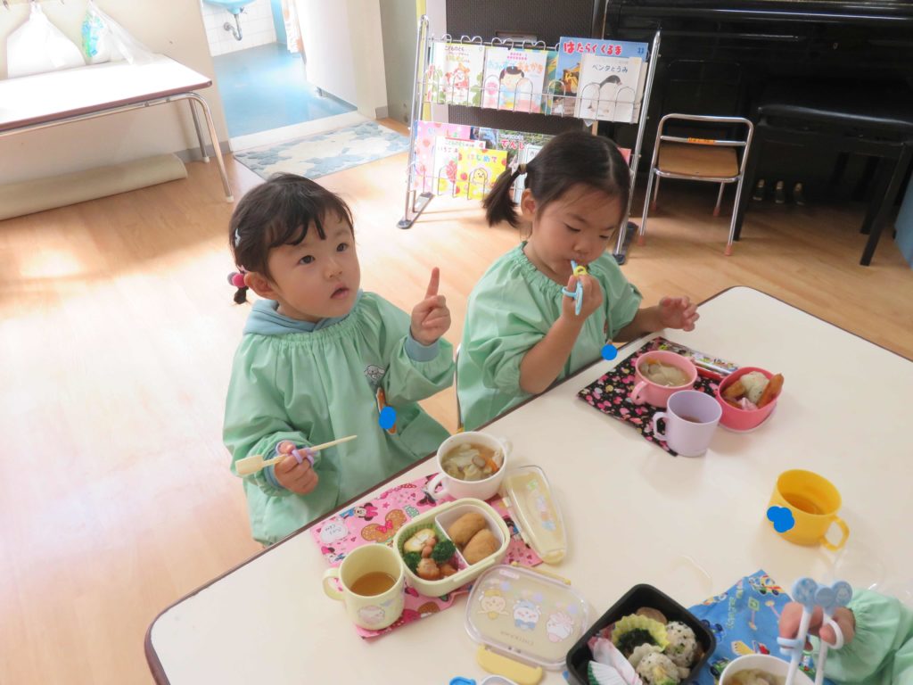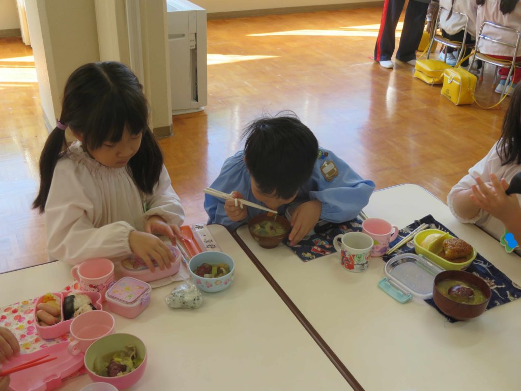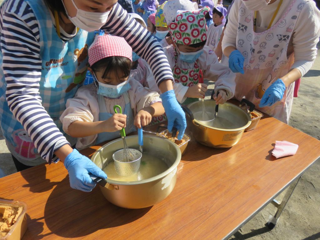 降園時は保護者様にも食べていただきました。「いつもお弁当作りをありがとう!ぼくたち、私たちが作ったさつま汁を食べてね」と招待状をお渡していたのでたくさんの方にお越しいただきました。コロナ禍以降、久しぶりに親子で食べていただくようにしました。微笑ましい光景でした♫