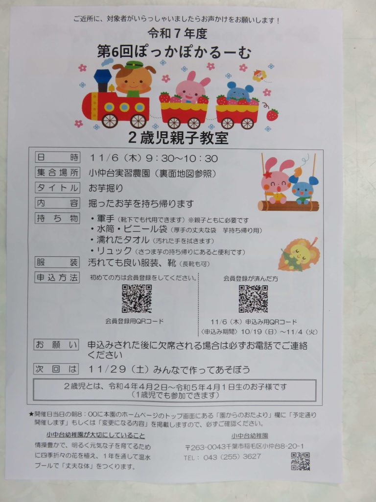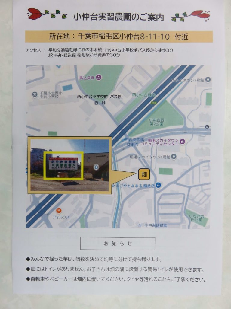 小中台幼稚園の実習農園(稲毛区小仲台8-11-10)にてお待ちしております。