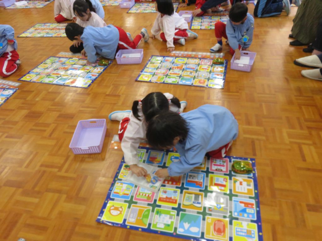 小学校につながる活動「プログラミング」…昨年度からの取り組みです。プログラミングカーに指令を出して決められたゴールにたどり着けるように友達と2人組で様々な行き方を考え合います。ゴールできなくても、どうしてできなかったのかを考えて次回に繋げています。夢中で取り組み、あっという間に時間が過ぎていきます。