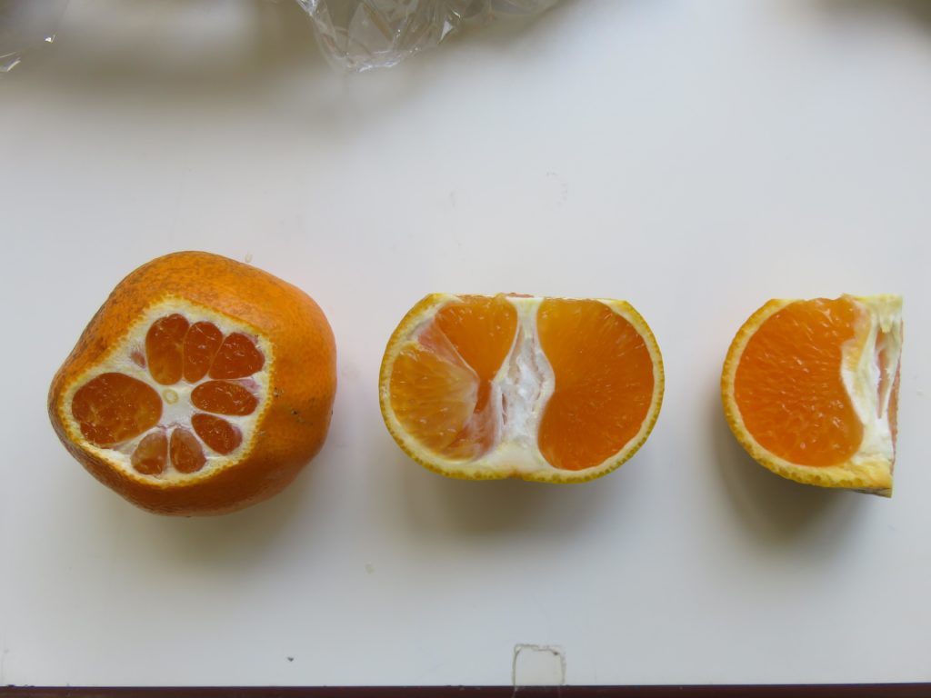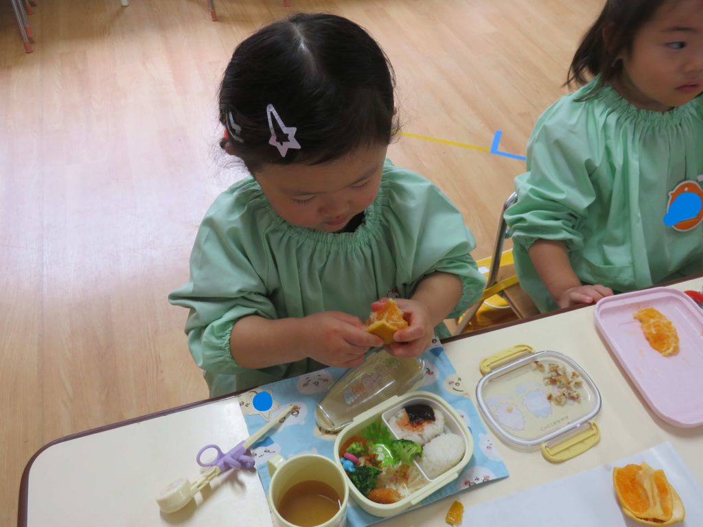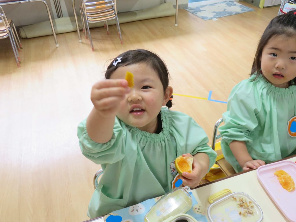 みかんは…学年毎に準備の仕方を変えています。自分で皮を剥くように仕向けています。2回目になりましたので年長組は全て自分で、年中組は上部を切り落としたものを、年少組は半分に切ったものを、満3歳児組は四分の一に切ったものを剥きました。お店で売られているみかんのように柔らかくないので苦労していましたが、1回目は「やって!」だった子たちも自分で挑戦するようになりました。