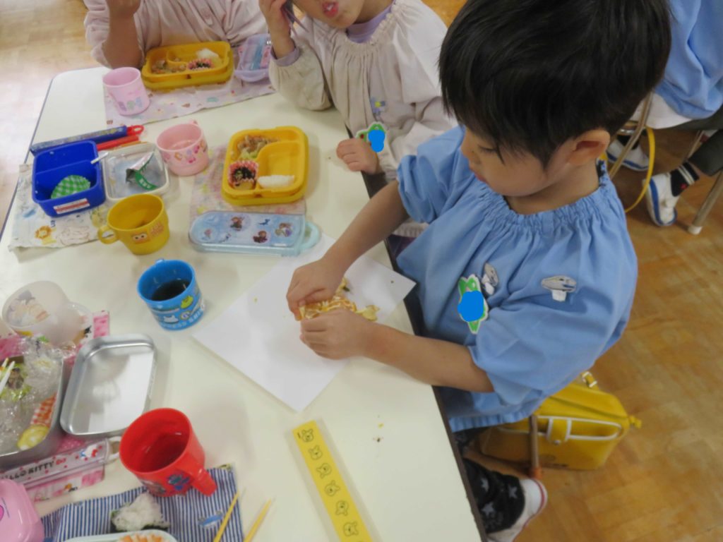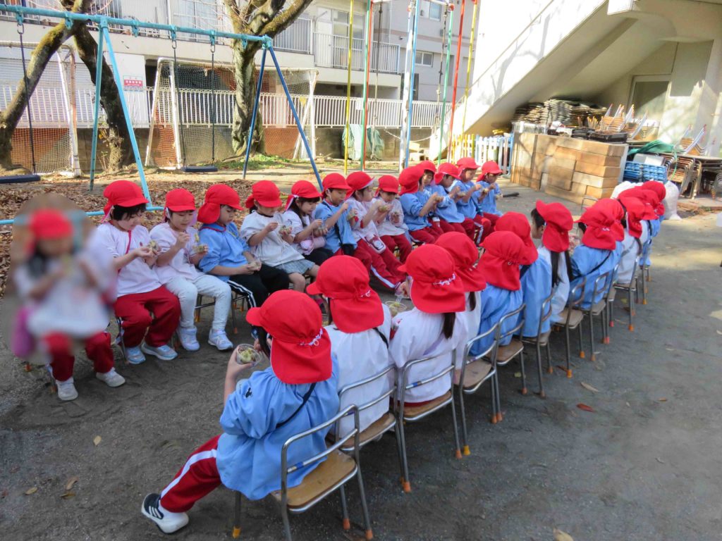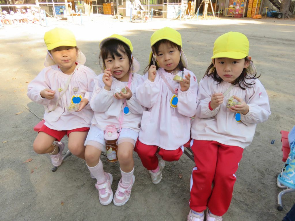 お芋ほり後に秋の味覚をみんなで味わうパーティーを何度か行っています。子どもたちに食育活動を通して苦手なものを食べてみようとしたり、食べるまでの大変さを知ってもらったりと楽しい中にも学びがあるように進めています。昨日は2回目の「みかん」今日は2回目の「大学芋」を食べました。