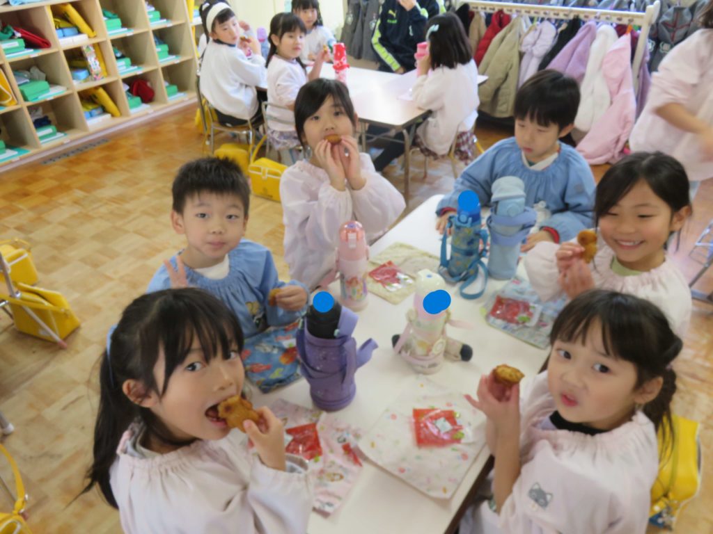 今日のおやつはくまちゃんマドレ―ヌ(クリスマスパッケージ)キャラメル味です。「可愛い~」「もったいなくて食べられないよ…」「どこから食べる?」と会話をはずませながらいただきました。