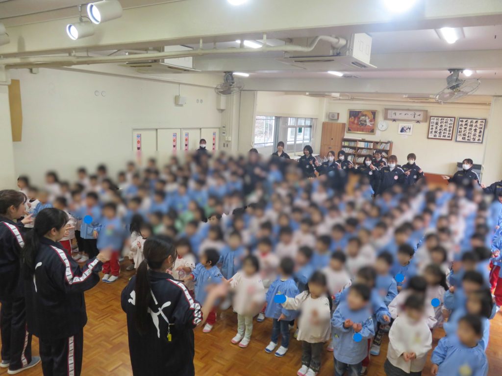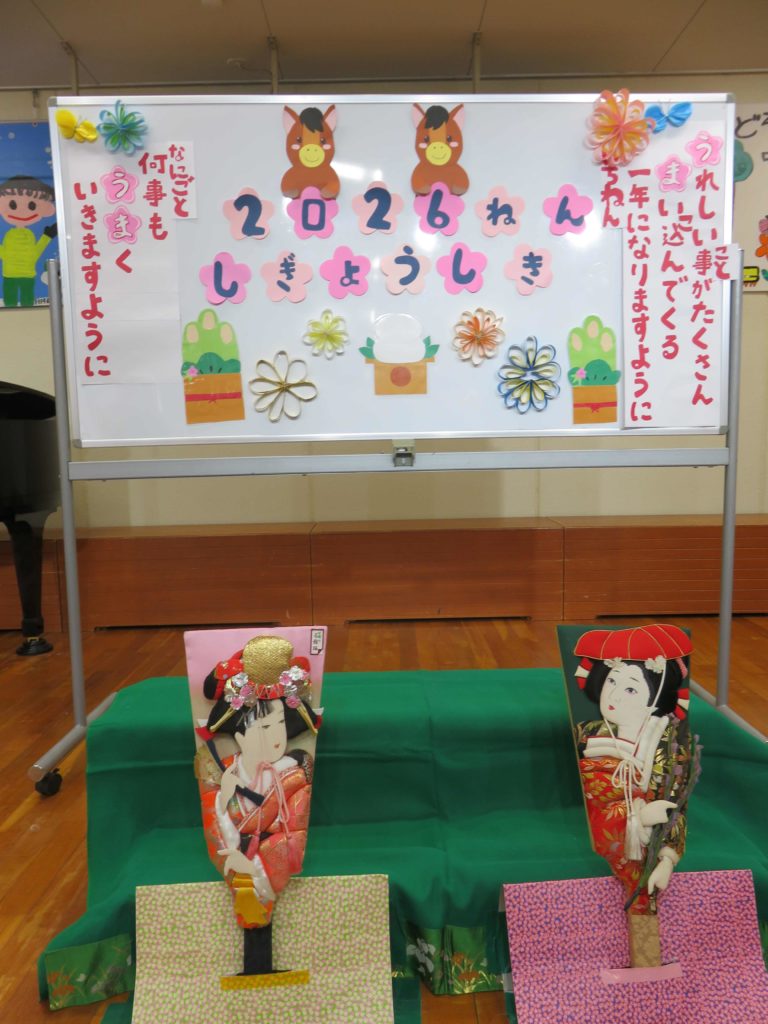 久しぶりの登園は「あけましておめでとうございます」と元気に挨拶を進んでする子がたくさんいました。友達や保育者との久しぶりの再会を喜び、冬休み中の体験を報告しあっていました。新しい年、午年について始業式の中で話題になり、馬は速く走れる、荷物を運ぶ力持ち、元気に走り回る、人を乗せてくれる…と共感しあいました。とても力強く人の役に立つ動物なので「馬のように頑張ろう!」と話が進みました。3学期は「苦手なことを頑張る」ことをみんなで約束したのでますますかっこいい姿を見せてくれることでしょう。寒さに負けず楽しい毎日になりますように・・・。