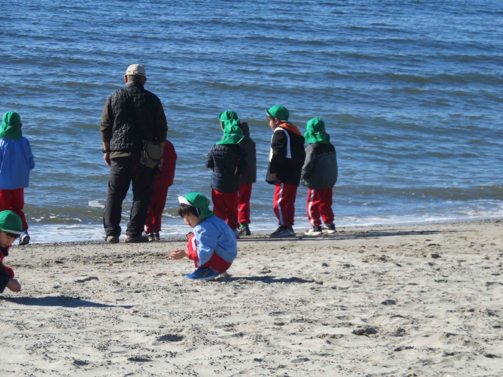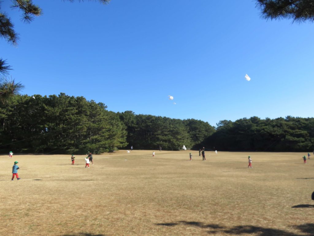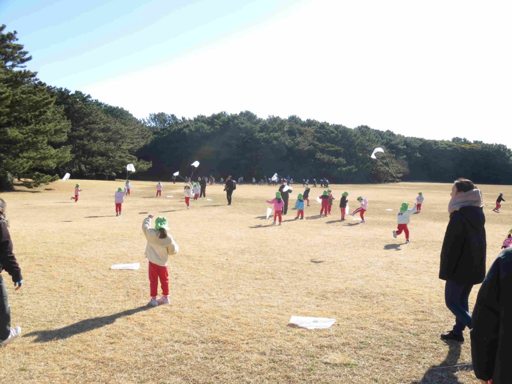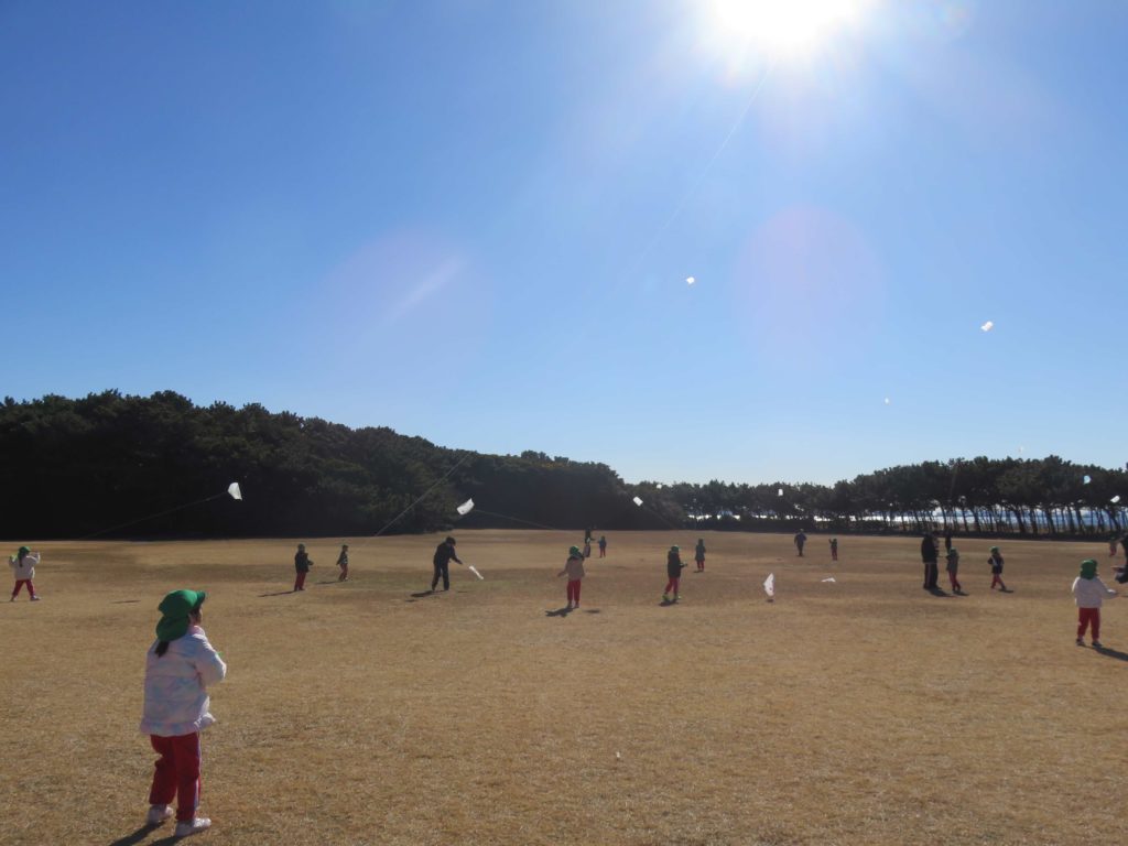 クリスマス会でサンタさんにいただいた凧を持って、稲毛海浜公園へ行きました。寒さを心配しましたが、上着を脱ぐ子もいて、元気に遊んできました。園庭は狭いので凧揚げがなかなかできませんが、今日は思い切り走ったり、風邪の勢いでぐんぐん凧があがっていく感覚を味わったりしました。