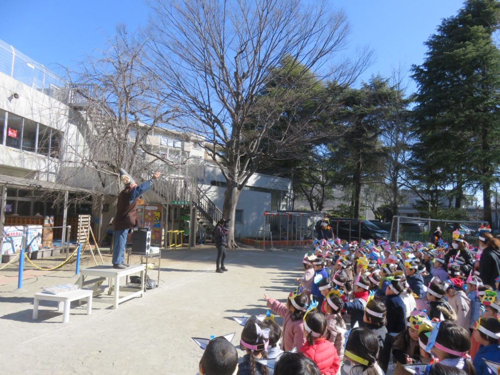 園庭に集まり、福の神に扮した先生が福豆を持って登場!「まめまき」の歌をうたって、福の神がまく豆を受けた後は代表の子が豆をもらい、クラス毎にお腹めがけて豆をぶつけ合いました。