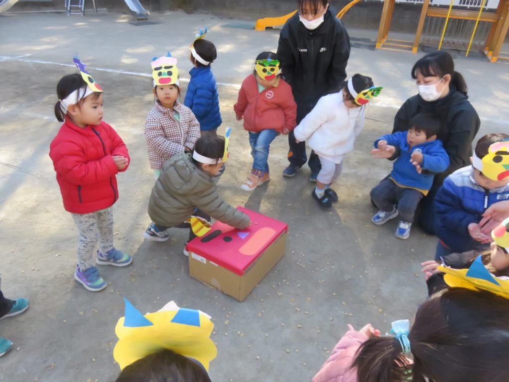 小中台幼稚園では毎年お腹の中にいる鬼(自分の欠点)を豆まきで追い出します。何鬼がいるかを悩みながら決めます。始めは「鬼なんかいない!」と言っていた子も友だちの鬼を聞いたり、見たり、お面作りを進めたりするうちに追い出したい鬼が決まりました。泣き虫鬼、おこりんぼう鬼、いばりんぼう鬼、恥ずかしがりや鬼、あわてんぼう鬼…等々いろんな鬼がいましたが、元気よく「鬼は~外!」と豆をまいたことで逃げていきました。