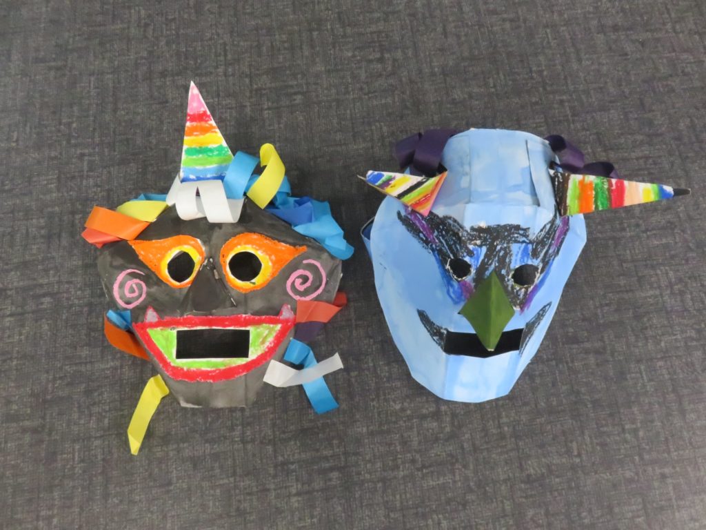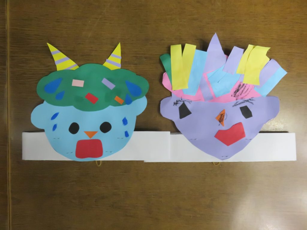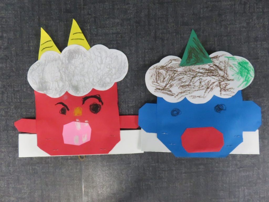 年長組「わすれんぼう鬼」と「怒り鬼」…平面上の1枚の用紙から立体的なお面ができました。