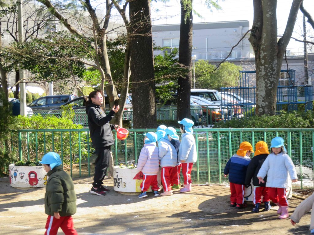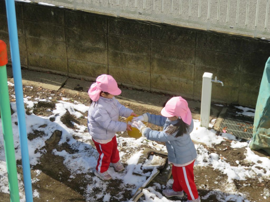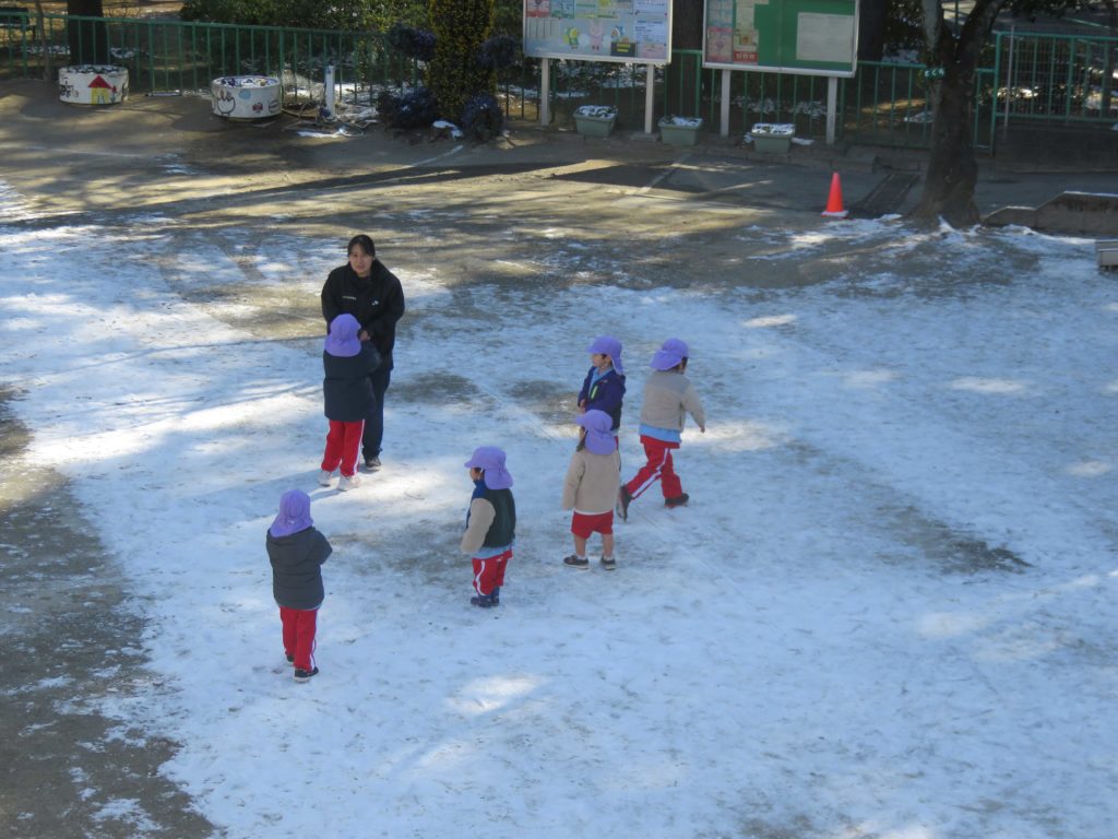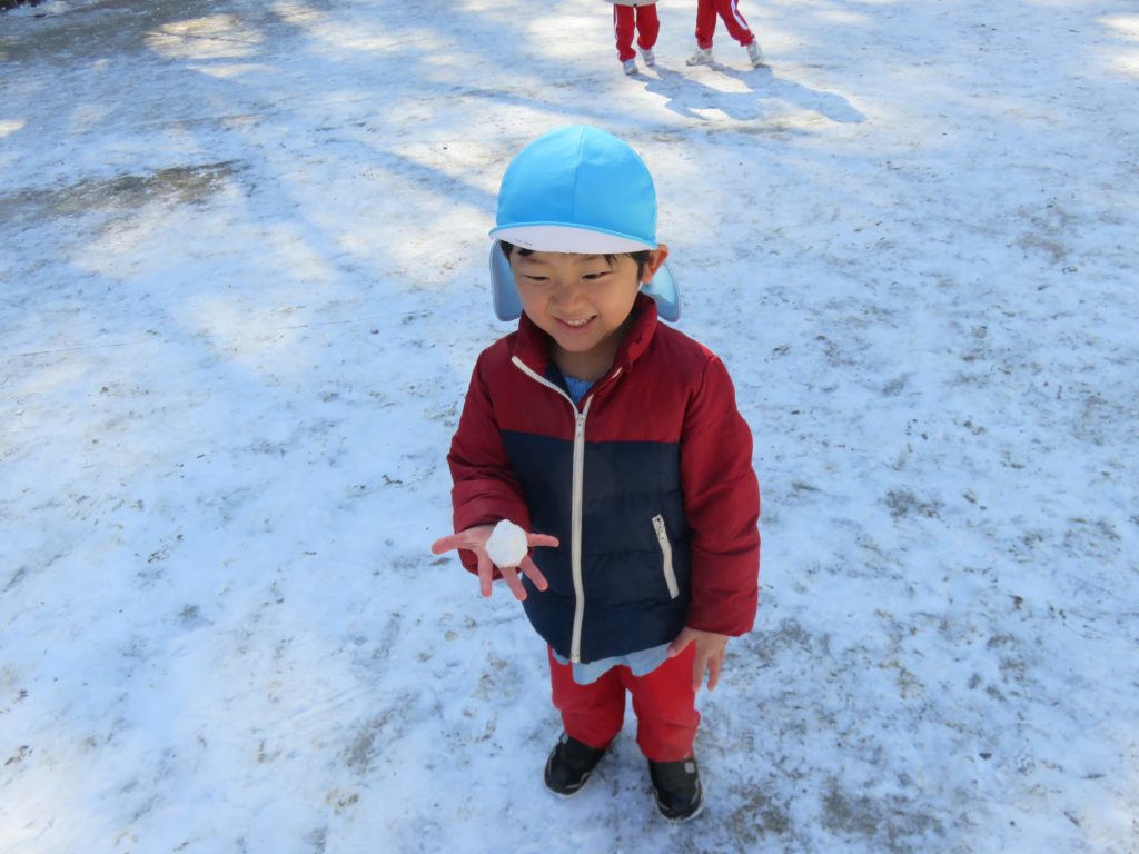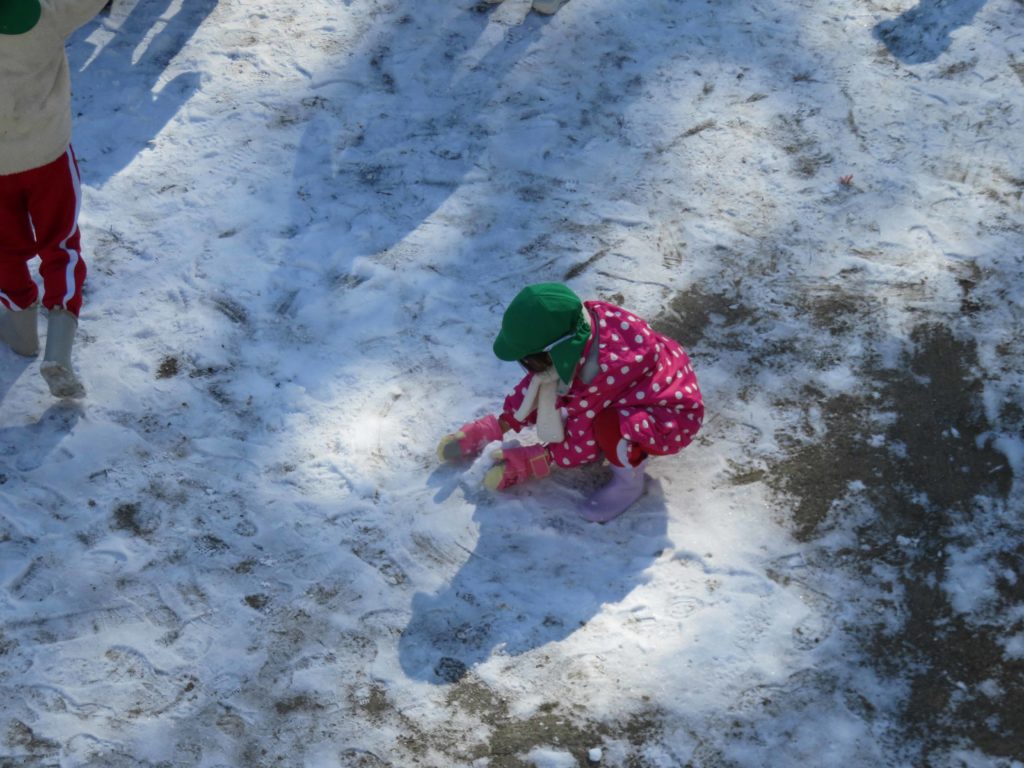 雪は固くなっていたり、氷になっていたりしましたが、それでもみんな、大喜び!ほんの少しの時間ですが雪遊びをしました。柔らかい雪を探して集めたり、氷を触ったり、お団子にしたり…千葉市ではめったに積もることがないので、幼稚園のお友だちや先生と一緒に遊んだことはとてもいい経験になりました。冷たくても寒くても元気いっぱいでした。