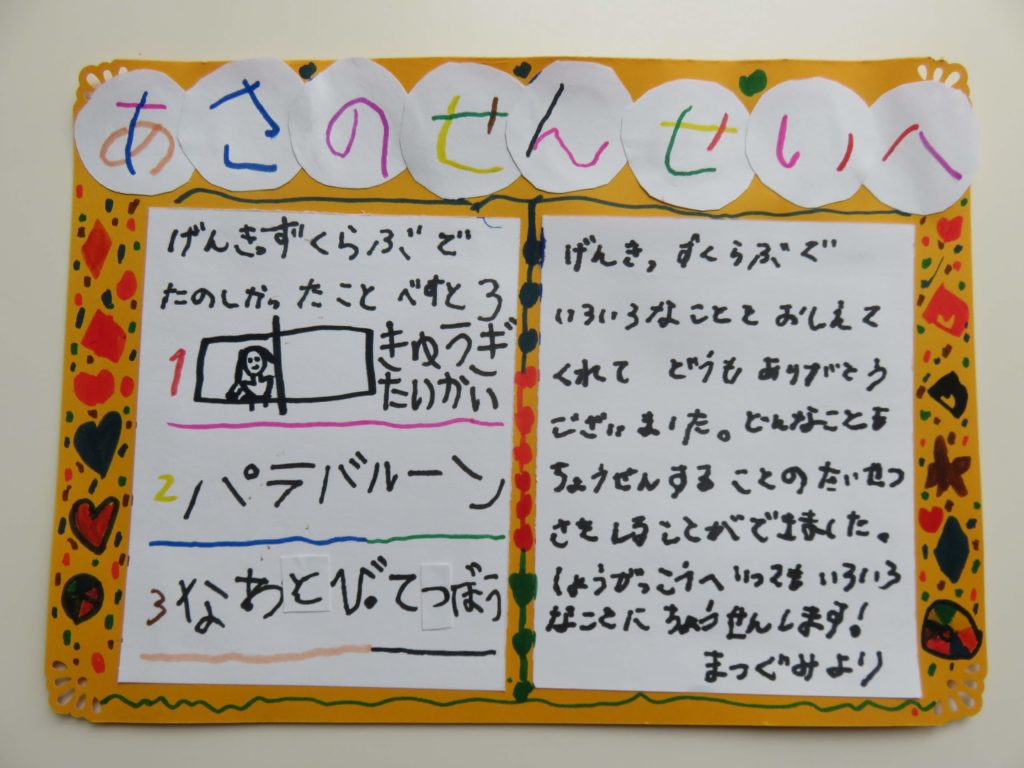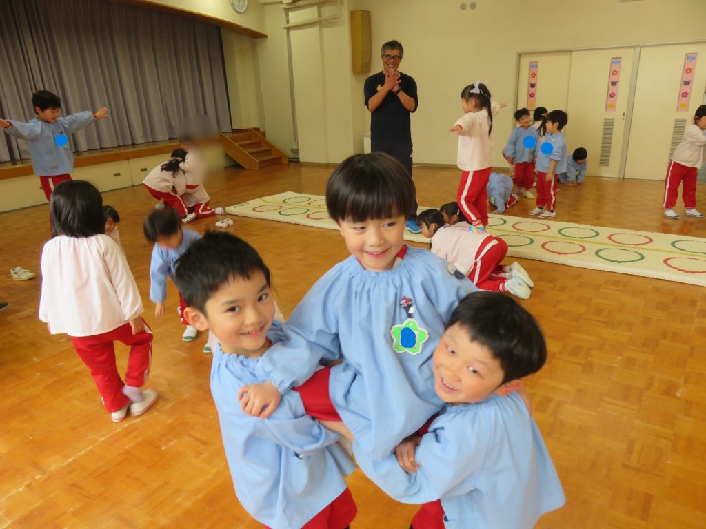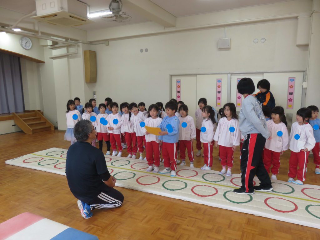 講師の浅野先生には入園当初から、一番長い子はひよこ組で入園した時から体を動かす楽しさを教わりました。また、苦手なことに挑戦できるように背中を押してもらいました。できなくてもいい、やってみよう、やると決めたならば頑張ろう、励まし合おう・・・等々。お陰で毎回楽しく参加できました。最後の挨拶時に子どもたちから感謝の想いをお伝えしました。
