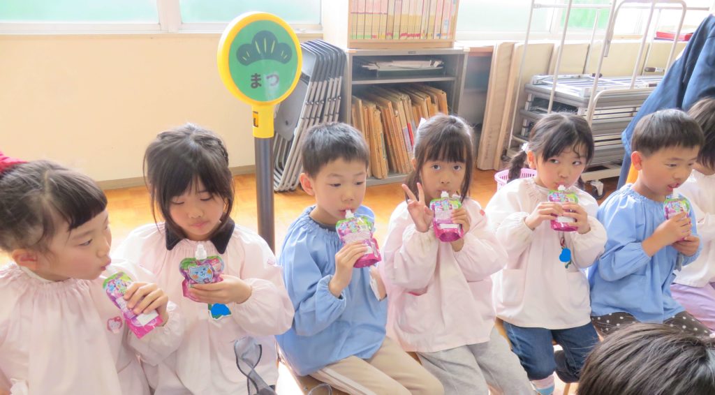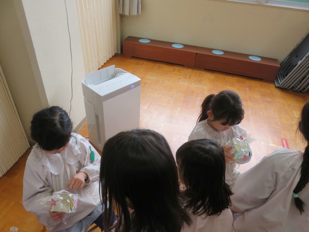 手作りのプレゼント(鉛筆立て)をいただきました。年中・年少・満3クラスの子たちが共同製作をしてくれました。「絶対に使う!」「もったいないから袋のまま飾る~」「ずっと大切にするね…」と年長さんは喜んでいました。送る側も送られる側もワクワクした楽しい一日でした。明日は卒園式、立派な姿を見せてくれることでしょう。