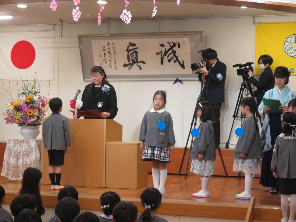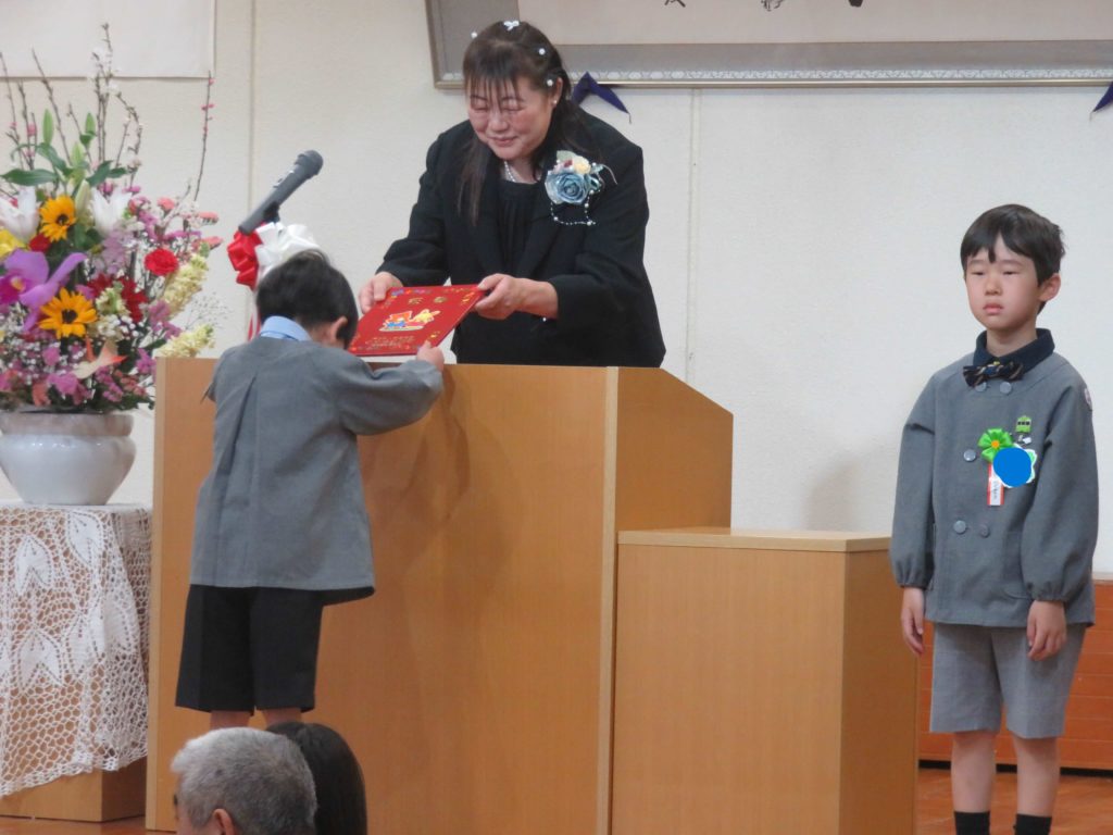 修了証書授与…一人ずつ返事をしてから演台前に進み、お辞儀をしながら受け取ります。その後、振り向いて保護者様に見ていただきます。